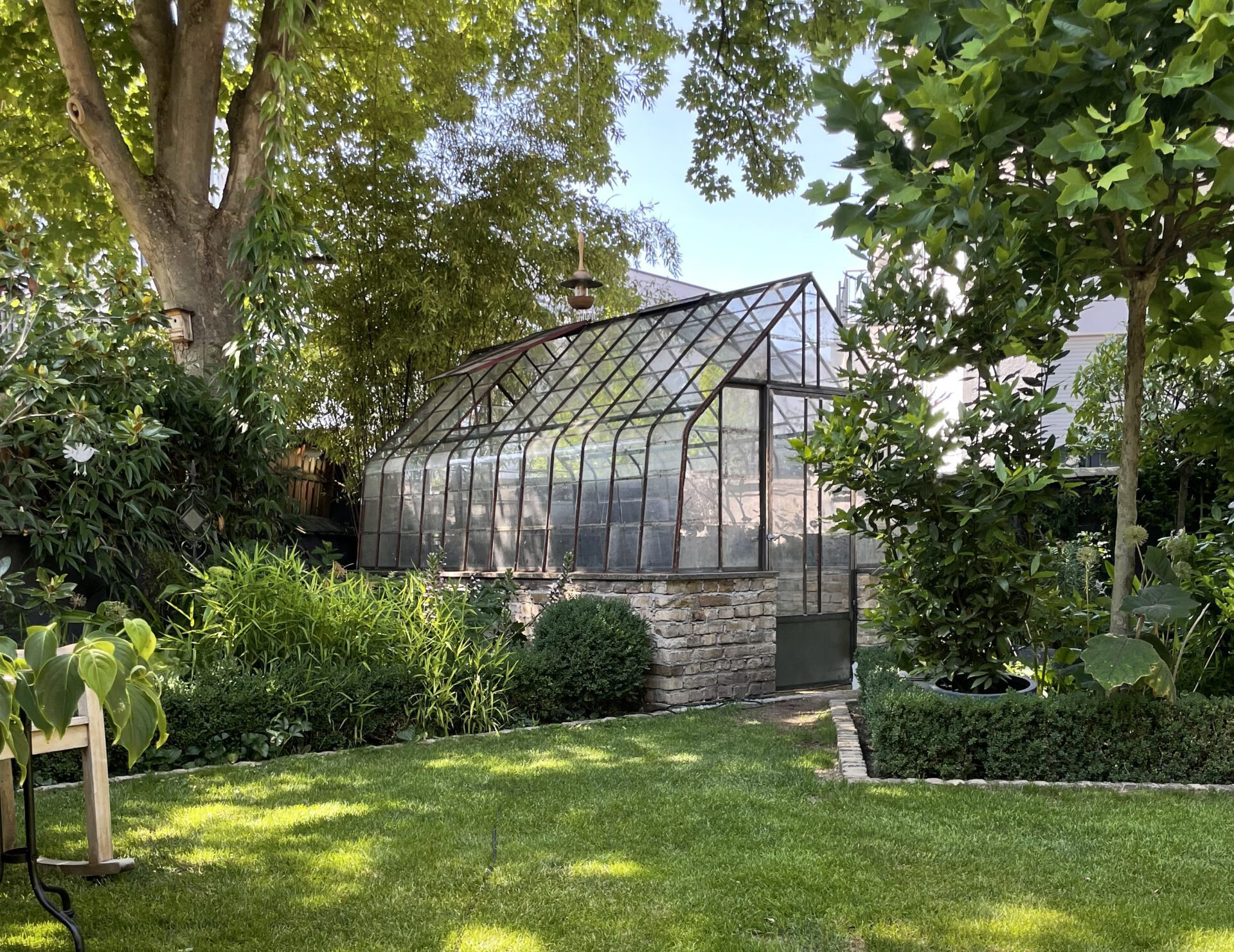 Ländlicher Staudengarten mit altem Baumbestand; Hanglage beim ältesten Haus des Dorfes