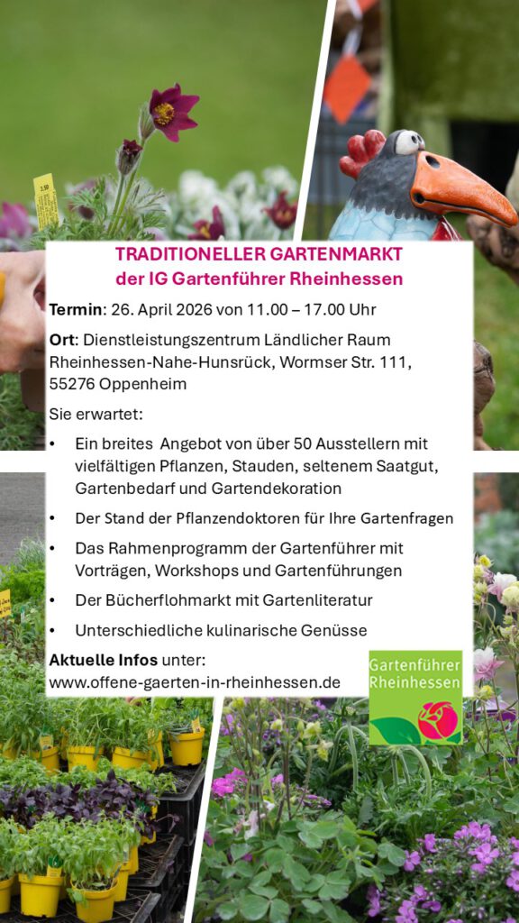 Unser Traditioneller Gartenmarkt am 27. April 2025 liegt hinter uns und wir durften viele Besucher auf dem Gelände des Dienstleistungszentrums Ländlicher Raum Rheinhessen-Nahe-Hunsrück in Oppenheim begrüßen. Bei bestem Wetter wurden eifrig Flyer verteilt, Workshops angeboten, die Sprechstunde der Pflanzendoktoren hatte geöffnet und viele Pflanzen wurden gekauft.